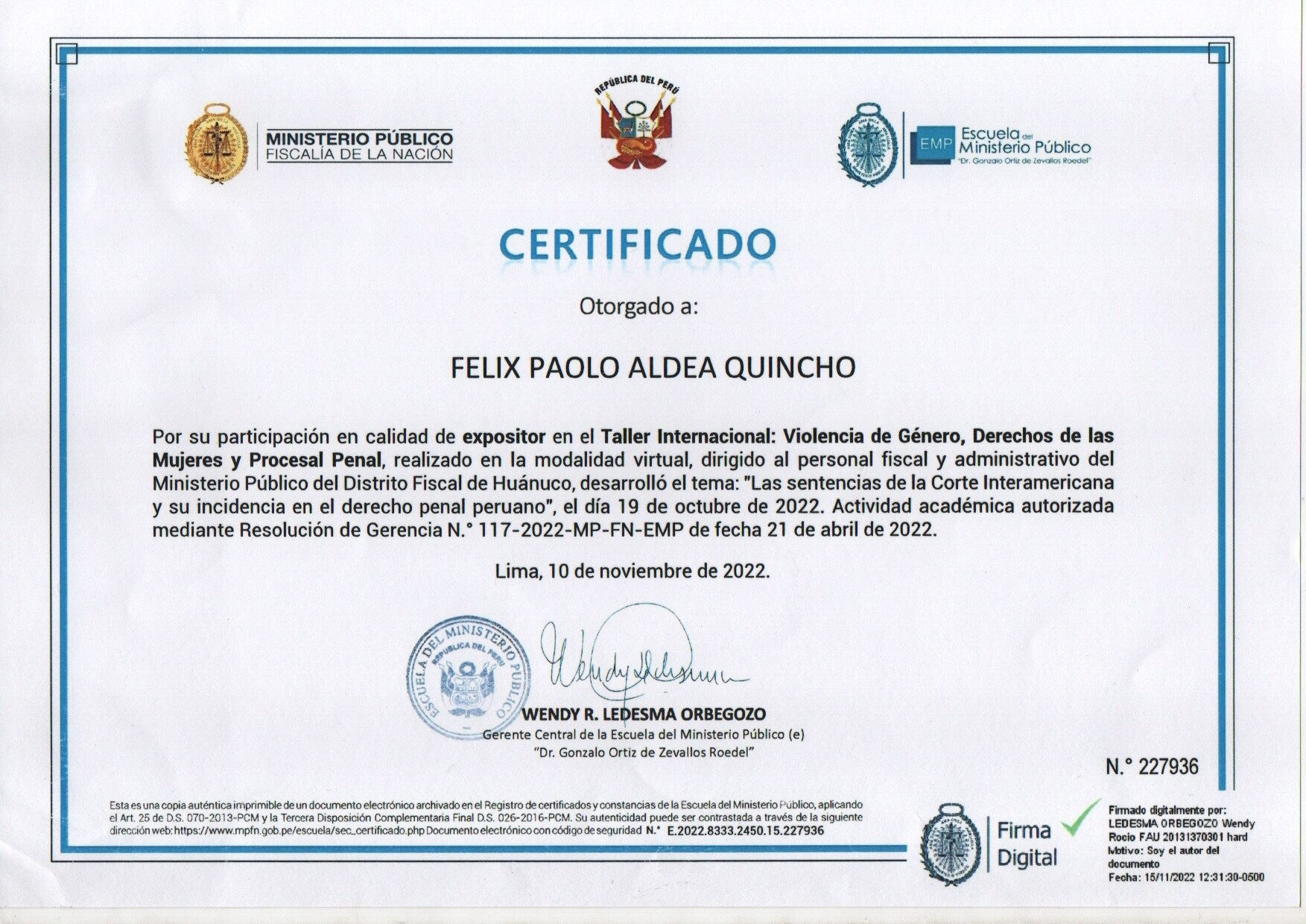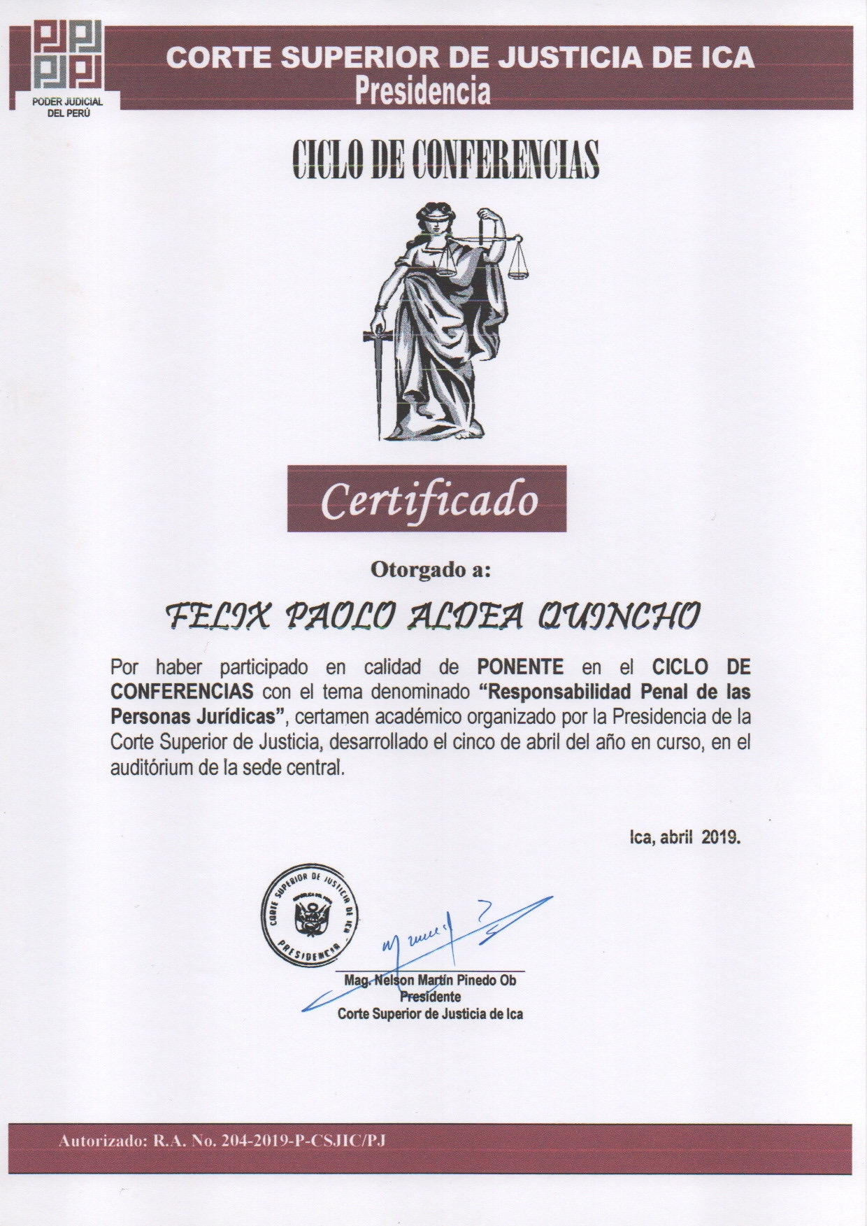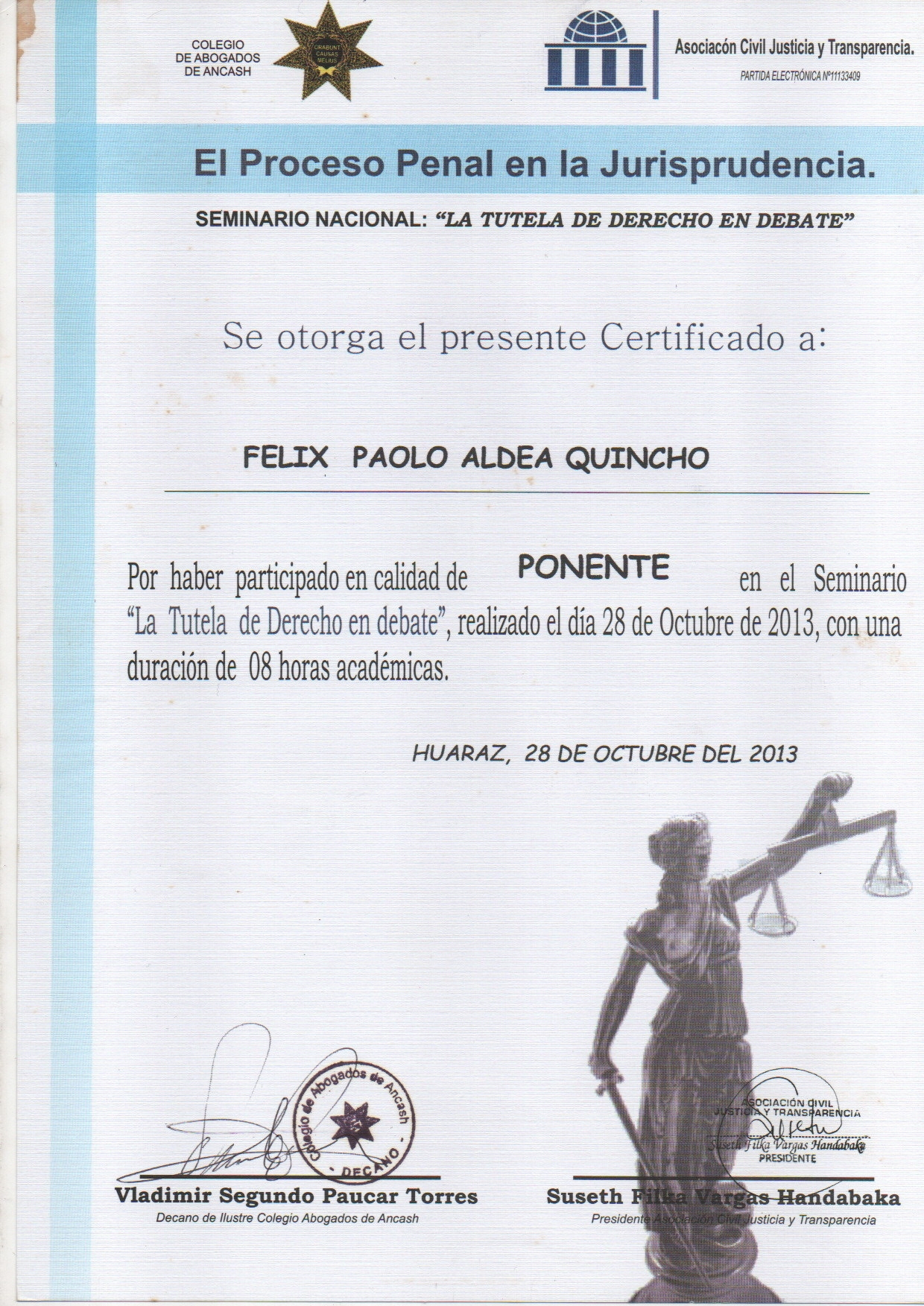 Por su excelente y destacada participación como ponente